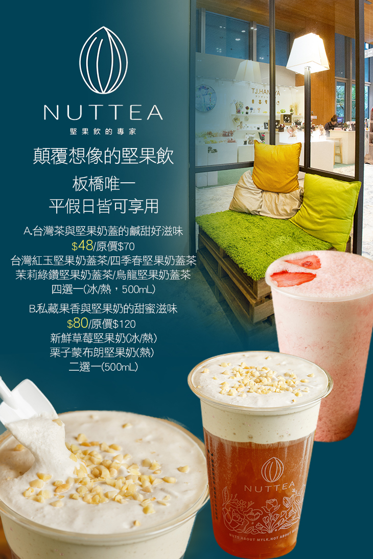 NUTTEA堅果奶茶專賣店,以堅果為品牌主軸,以VEGAN為理念,NUTTEA致力於堅果飲的發展,同時在台灣與香港都擁有分店。NUTTEA以五種堅果經過冷壓萃取,快速運轉乳化成為純堅果奶,搭配嚴選台灣紅玉紅茶與新鮮水果,創造一杯沒有牛奶的堅果奶茶。