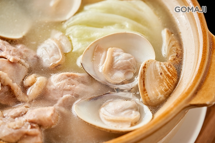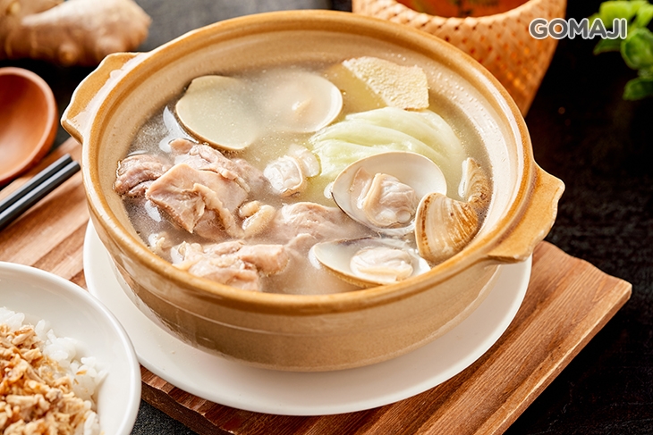 將新鮮溫體雞預先清洗處理後,加入高湯文火烹煮,雞肉隨著湯底漸漸沸騰後,不斷釋放鮮美甘甜的精華!湯底色澤越煮越乳白、越煮越香!最後加入翠綠高麗菜及靈魂主角 - 肥美蛤蠣翻拌烹煮,蛤蠣逼逼啵啵如蝴蝶一般展開雙翅飛翔!湯鮮味美,每一口都是海陸雙拼所打造而來的美味!用餐時刻來上一份,營養豐富、幸福滿分!