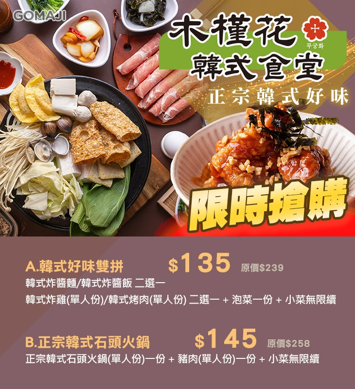 專營道地美味韓式料理的【木槿花韓式食堂】與夠麻吉攜手推出超值專屬優惠啦!