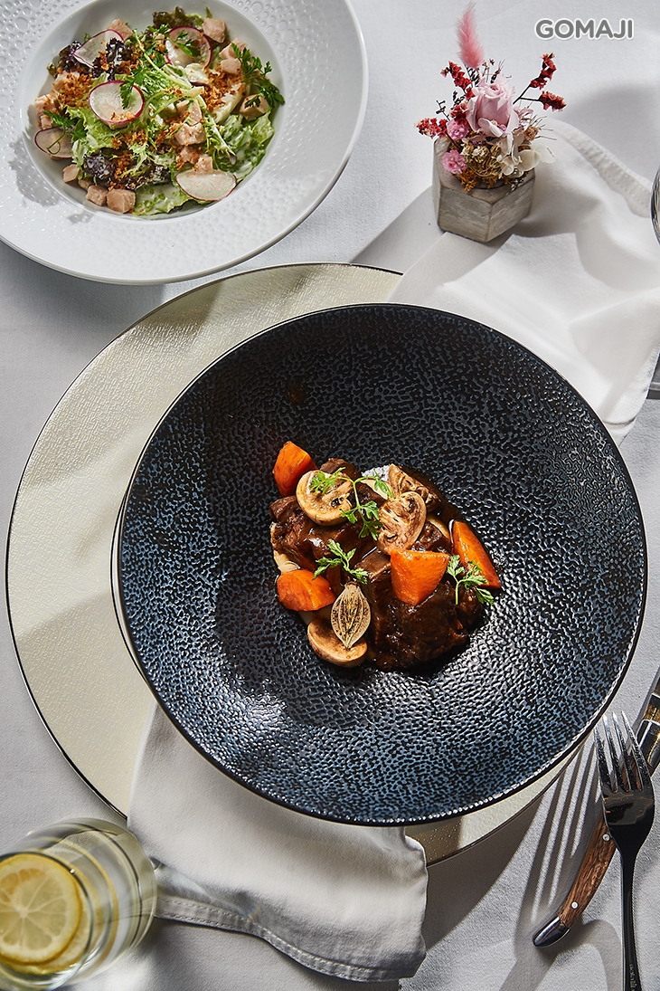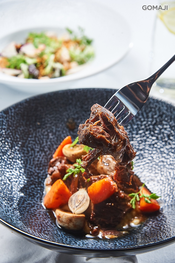 接著,這道Julia Child紅酒燉牛肉,添富長年收藏、擁有時間淬鍊的高級紅酒香的燉牛肉,端上桌,香氣陣陣撲鼻而來 ~ 以特選品質上等,無論油花還是筋分佈,每一個細節都嚴苛篩選與追求講究的牛肉為基底,倒入紅酒與紅蘿蔔、野菇一同費時燉煮。時間滴答過去,牛肉被燉煮得上色且入味,入口筋肉一咬即化即分離的滋味,正是此道菜色的經典。帶點微微蔬果鮮香與鮮甜好對味,讓人一口接著一口吃到盤上連一滴醬汁都不剩喔!