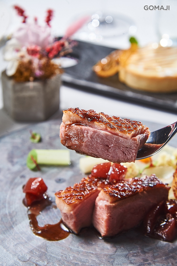 特選頂級鴨胸肉,以最能夠展現食材新鮮與天然美味的烹飪方式 - 香煎來製作。擁有豐富脂肪的外皮,經由文火香煎後,井然有序的格子紋路,蘊含著誘人可口的濃郁脂香 ~ 塊塊粉嫩肥美,搭配主廚用那細膩婉約的姿態所詮釋的巧手擺盤,美味更加精彩!刀叉切下,入口細嚐,那柔嫩鮮香的滋味,讓人瞬間擁有戀愛般的感覺。