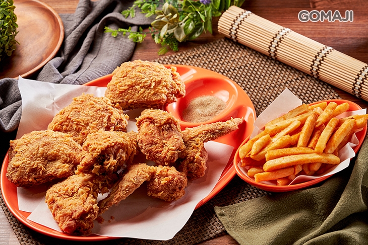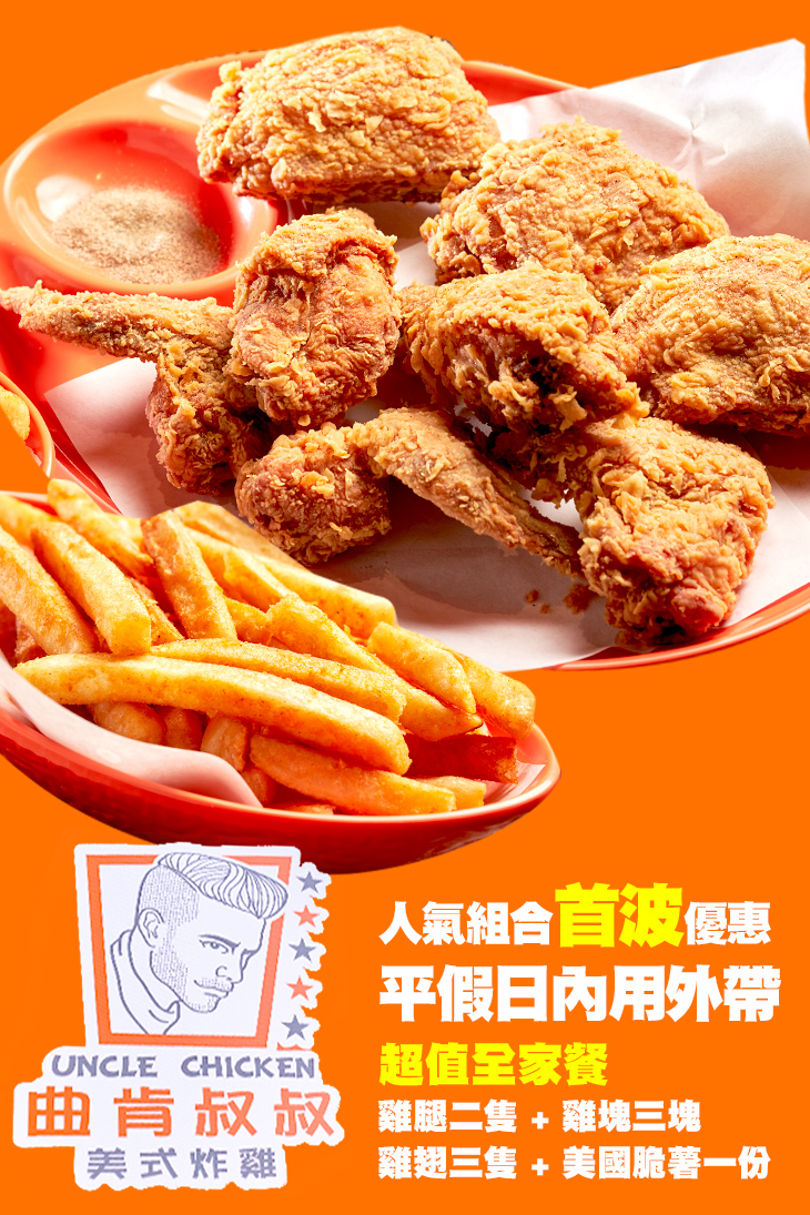 〈雞腿二隻 + 雞塊三塊 + 雞翅三隻 + 美國脆薯一份〉