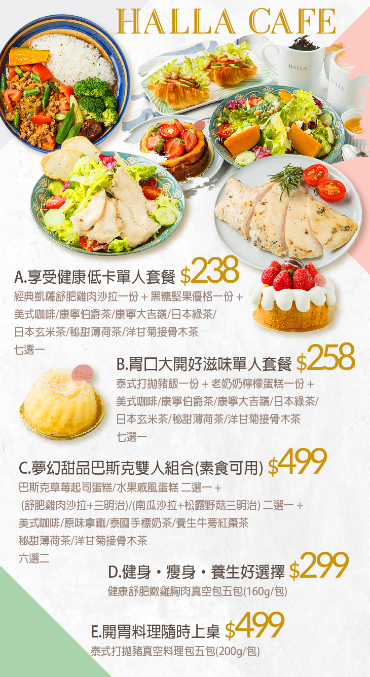 A.享受健康低卡單人套餐 / B.胃口大開好滋味單人套餐 / C.夢幻甜品巴斯克雙人組合(素食可用) / D.健身‧瘦身‧養生好選擇 / E.開胃料理隨時上桌