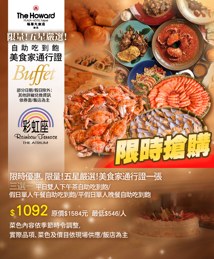 限時優惠,限量!五星嚴選!美食家通行證一張 (三選一:平日雙人下午茶自助吃到飽/假日單人午餐自助吃到飽/平假日單人晚餐自助吃到飽) (部分日期/假日除外;其他詳細兌換資訊依券面/飯店為主)