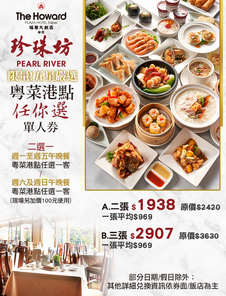 限量!五星嚴選! (二選一:週一至週五午晚餐粵菜港點任選一客/週六至週日午晚餐粵菜港點任選一客(現場另加價100元使用) (部分日期/假日除外;其他詳細兌換資訊依券面/飯店為主)