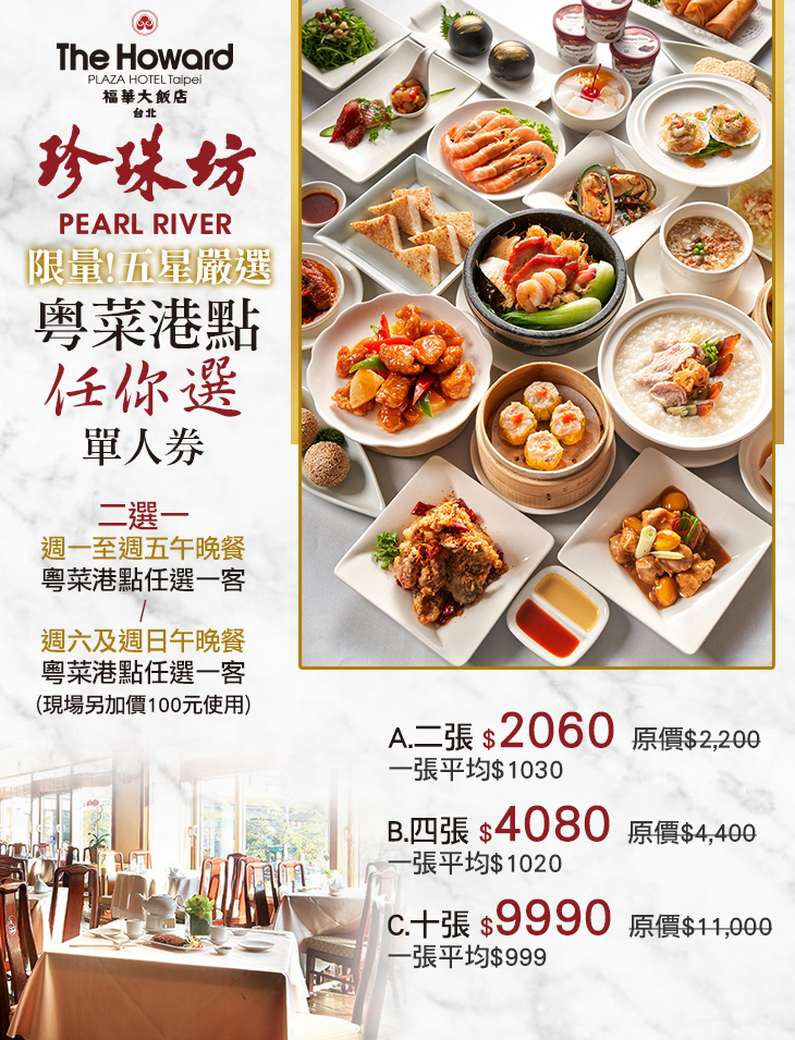 限量!五星嚴選! (二選一:週一至週五午晚餐粵菜港點任選一客/週六及週日午晚餐粵菜港點任選一客(現場另加價100元使用)(部分日期/假日除外;其他詳細兌換資訊依券面/飯店為主)