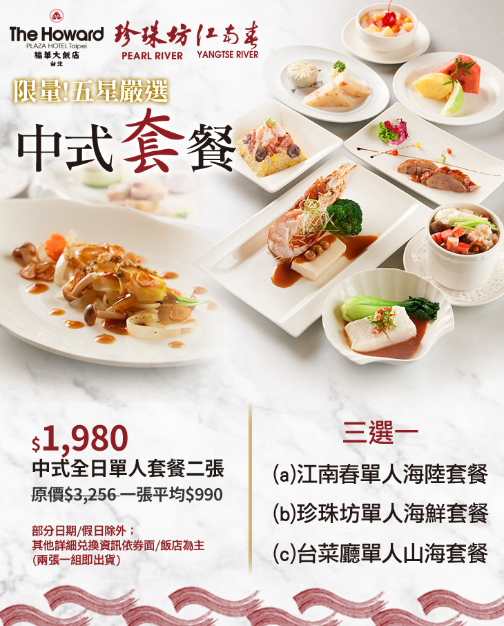 限量!五星嚴選! (三選一:江南春單人海陸套餐/珍珠坊單人海鮮套餐/台菜廳單人山海套餐)(部分日期/假日除外;其他詳細兌換資訊依券面/飯店為主)(兩張一組即出貨)