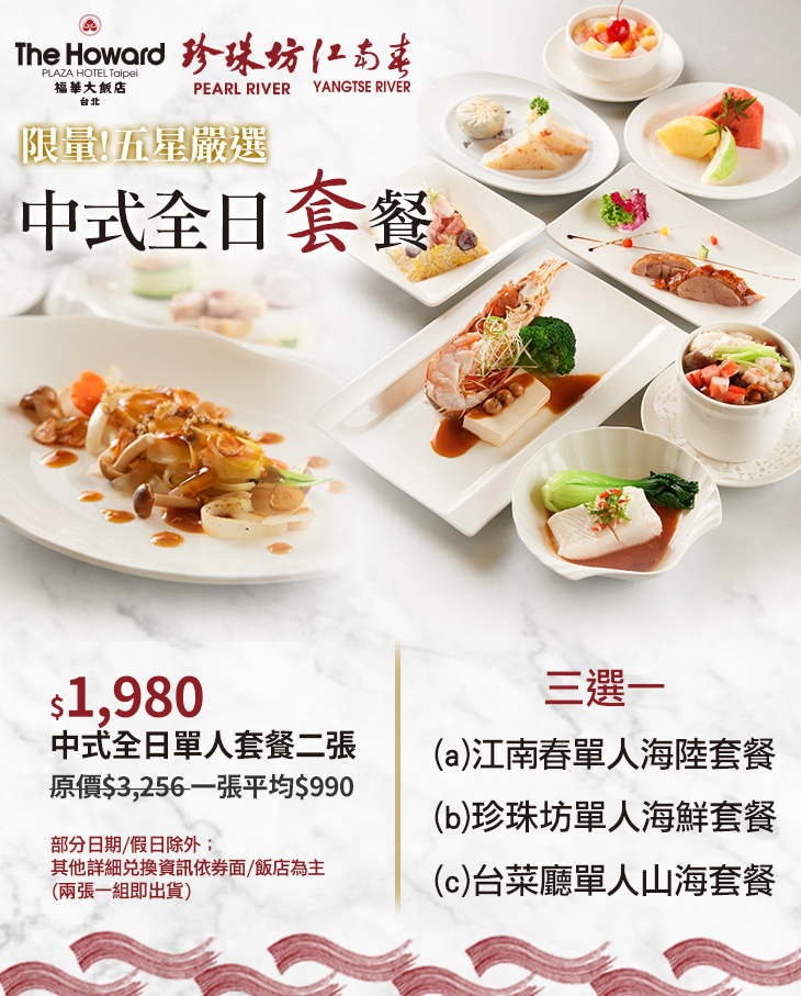 限量!五星嚴選! (三選一:江南春單人海陸套餐/珍珠坊單人海鮮套餐/台菜廳單人山海套餐)(部分日期/假日除外;其他詳細兌換資訊依券面/飯店為主)(兩張一組即出貨)