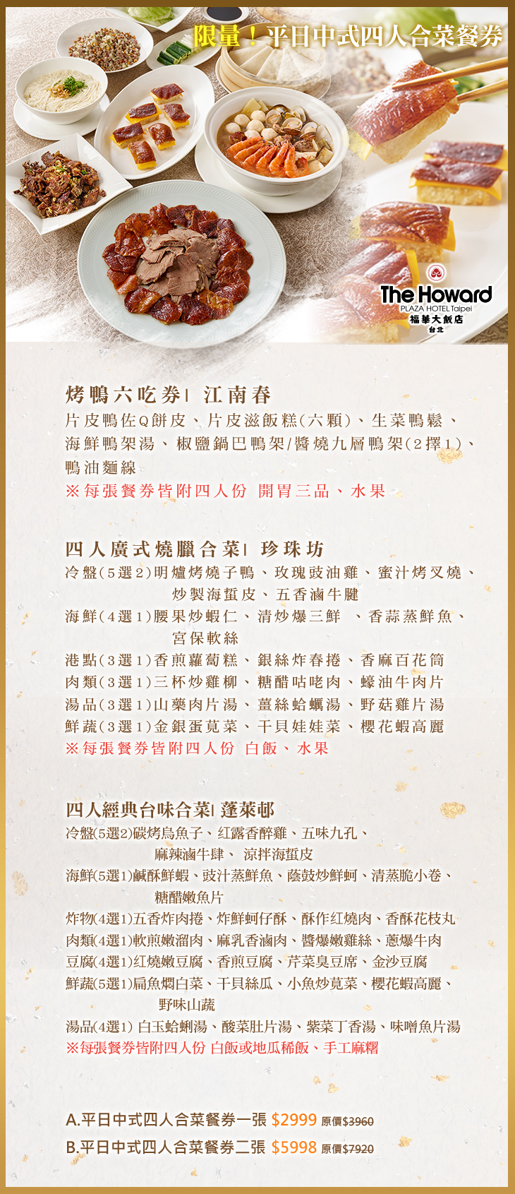 ※餐券為四人券,故菜單內品項僅會提供四人份,但一張券可超過4人使用,茶資另計,建議最多6人,因烤鴨份量皆為固定的。