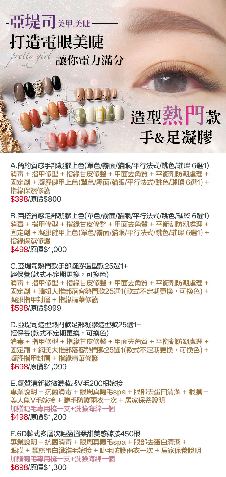 A.簡約質感手部凝膠上色(單色/霧面/貓眼/平行法式/跳色/璀璨 6選1) / B.百搭質感足部凝膠上色(單色/霧面/貓眼/平行法式/跳色/璀璨 6選1) / C.亞堤司熱門款手部凝膠造型款25選1+輕保養(款式不定期更換,可換色) / D.亞堤司造型熱門款足部凝膠造型款25選1+輕保養(款式不定期更換,可換色) / E.氣質清新微微濃妝感V毛200根嫁接 / F.6D韓式多層次輕盈溫柔甜美感嫁接450根