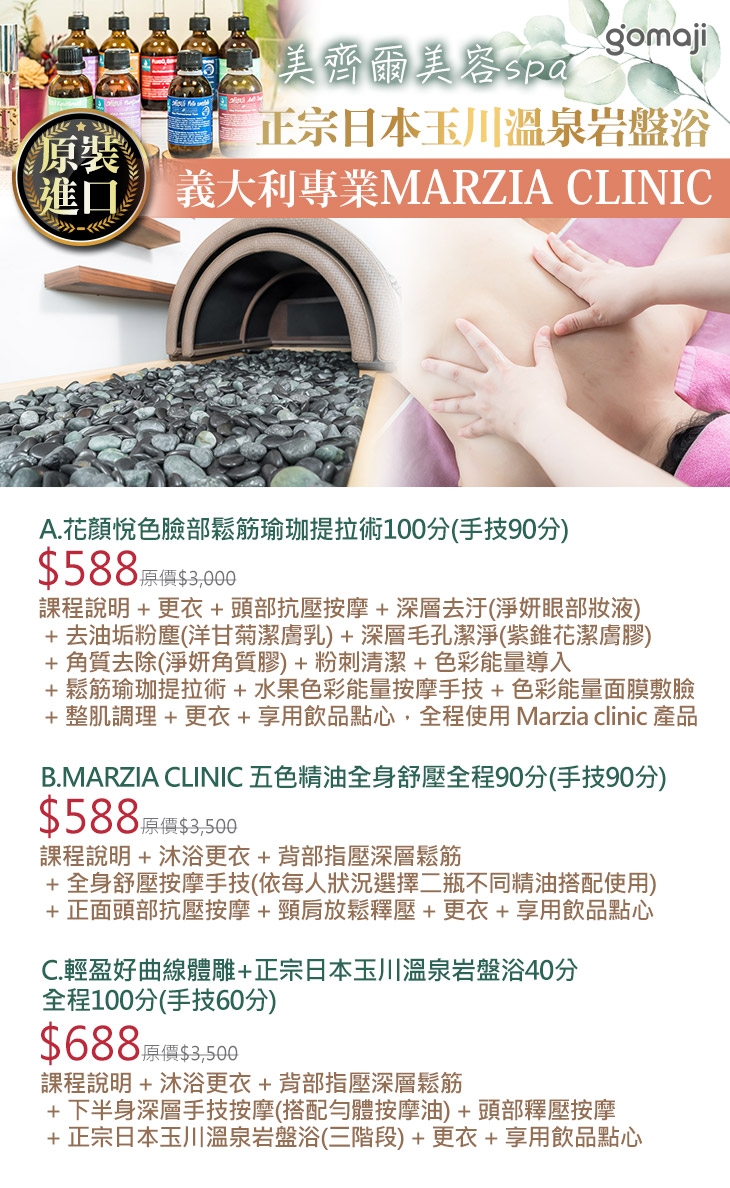 A.花顏悅色臉部鬆筋瑜珈提拉術100分(手技90分) / B.MARZIA CLINIC 五色精油全身舒壓全程90分(手技90分) / C.輕盈好曲線體雕+正宗日本玉川溫泉岩盤浴40分 全程100分(手技60分)