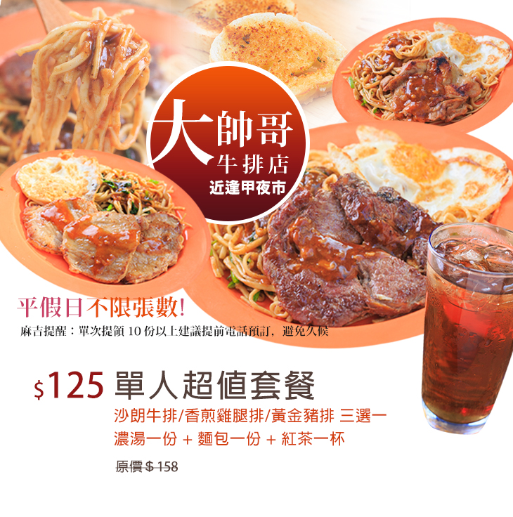 〝 價格讓人驚訝,滋味令人驚艷,值得推薦!〞如此好評,身為美食雷達的小編我,不推上一波,是不是就太小氣了呢!近逢甲夜市,每每營業時間一到,總是湧上大批顧客的【大帥哥牛排店】,是一間專營鐵板料理的人氣攤位,餐點提供以牛、雞、豬等香煎鐵板料理為主,新鮮食材,搭配獨門淋醬與噴香麵條,讓簡單的美味,因為【大帥哥牛排店】的熱情,而擁有截然不同的風味 ~ 用餐地點總是那幾間再交互輪替嗎?不妨試試小編推薦的吧,專屬美味,絕對讓您為之驚艷 ~