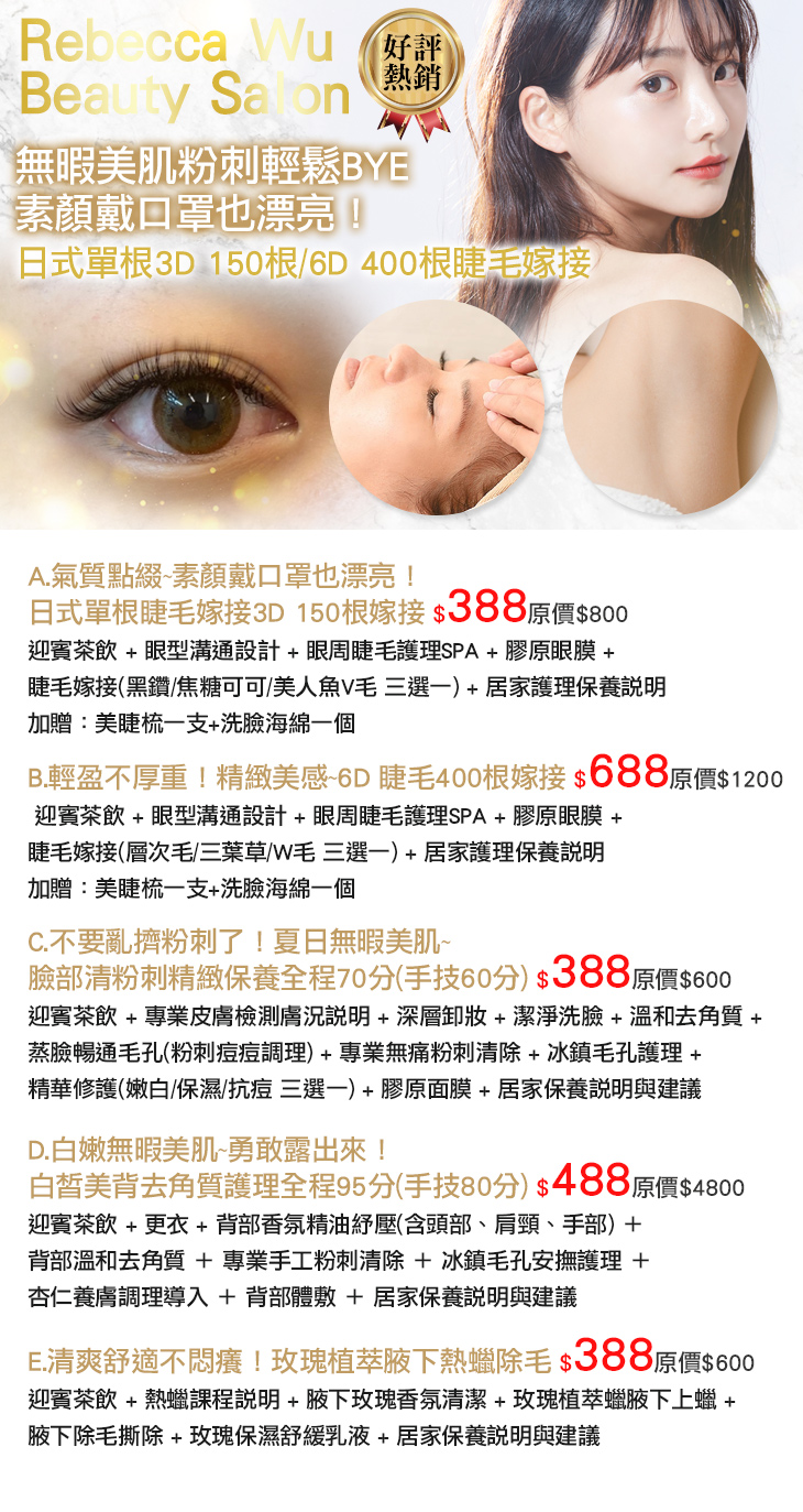 A.氣質點綴~素顏戴口罩也漂亮!日式單根3D 150根睫毛嫁接 / B.輕盈不厚重!精緻美感~6D 400根睫毛嫁接 / C.不要亂擠粉刺了!夏日無暇美肌~臉部清粉刺精緻保養全程70分(手技60分) / D.白嫩無暇美肌~勇敢露出來!白皙美背去角質護理全程95分(手技80分) / E.清爽舒適不悶癢!玫瑰植萃腋下熱蠟除毛