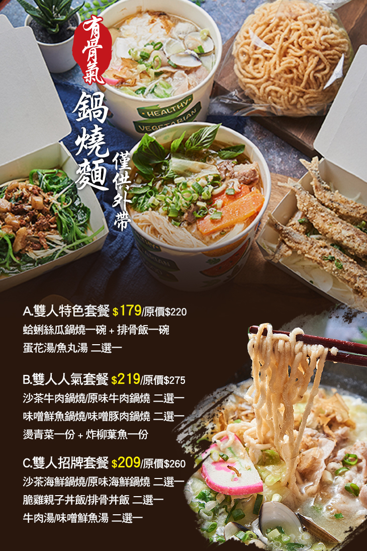 凡是來過【有骨氣鍋燒麵】的人,必定都會留下讚不絕口的好評價!嚴選食材入料精燉的醇香湯頭,香氣四溢、爽口宜人,富滿嚼勁的麵條與之相襯,經典的鍋燒美味不僅暖心又暖胃!隨著時令更換的多元菜單,讓您每一次光顧,都能擁有全新的感受,肚子咕嚕咕嚕叫了嗎?事不宜遲,快來【有骨氣鍋燒麵】欽點一份熱騰騰的鍋燒麵,好好大快朵頤一番吧!