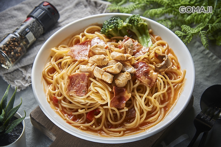 以蕃茄紅醬義大利麵為基底,加入新鮮鹹培根與雞肉調味拌炒!濃郁鮮香帶點微微酸甜的醬汁,與軟而不爛的麵條、真材實料的用料相襯,口感豐富、誘人可口啊!跟小編一樣對義大利麵紅醬系列為之瘋狂與著迷的麻吉,這道可別輕易錯過啦!