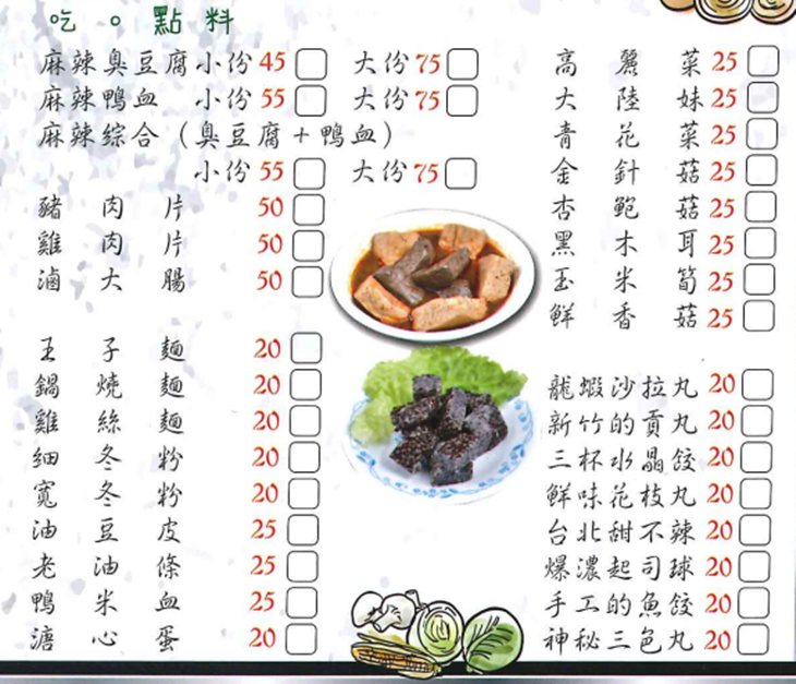 臭豆腐、鴨血吃不過癮別擔心!還有肉片與多種20元配料任您自由選、自由配!為麻辣燙增添更豐富迷人的味蕾體驗!