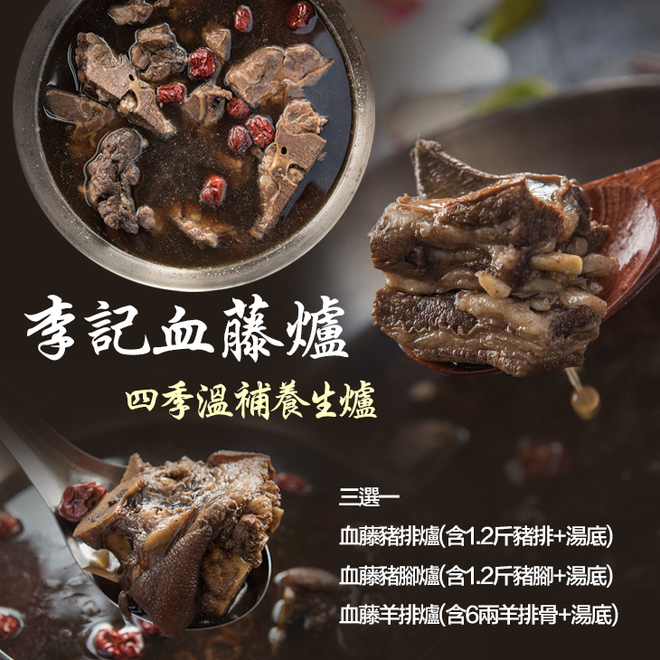精選新鮮羊排、遵循古法燉煮、湯頭美味獨特的【李記血藤爐】,自家招牌菜色 - 羊排爐,湯底是採用血藤跟十幾種中藥材,加上羊骨及數種蔬果現場熬製而成,濃郁香醇、口感迷人 ~ 再結合各式嚴選高品質的肉品、新鮮的蔬菜及火鍋料,「不用過多佐料調味,因為好的湯頭絕對可以讓食材展現最真實的美味。」一年四季都適合為自己溫補!忙碌的您,快邀請三五好友一同來【李記血藤爐】團聚享用,絕對帶給您最溫暖、最有溫度的用餐體驗與感受!