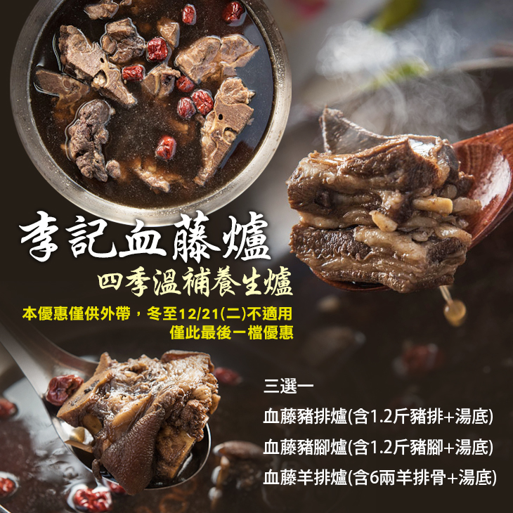 ★【李記血藤爐】粉絲們,快把握冬日進補的最後優惠機會!現在就把醇香濃郁、滋養補生的養生血藤湯帶回家,和家人一同享受身心都被療癒、滋潤的幸福感受吧!