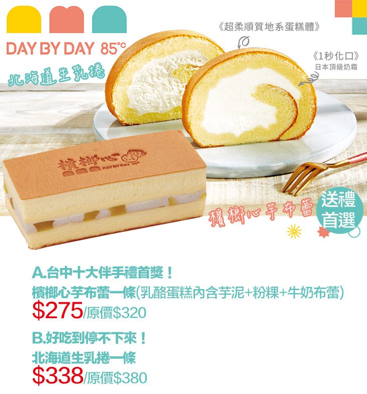 榮獲台中十大伴手禮首獎榮耀的「檳榔心芋布蕾」,是【DAY BY DAY】的人氣品項!香濃芋泥餡混合著Q彈的粉粿、奶香醇濃的牛奶布蕾,於濃而不膩的乳酪蛋糕中綻放無與倫比的美味,真材實料、甜香不膩口的滋味,為您點綴幸福的甜點時光!