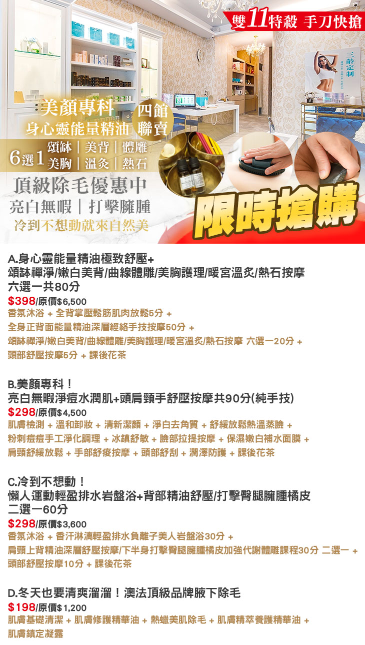 A.身心靈能量精油極致舒壓+頌缽禪淨/嫩白美背/曲線體雕/美胸護理/暖宮溫炙/熱石按摩 六選一共80分 / B.美顏專科!亮白無暇淨痘水潤肌+頭肩頸手舒壓按摩共90分(純手技) / C.冷到不想動!懶人運動輕盈排水岩盤浴+背部精油舒壓/打擊臀腿臃腫橘皮 二選一60分 / D.冬天也要清爽溜溜!澳法頂級品牌腋下除毛