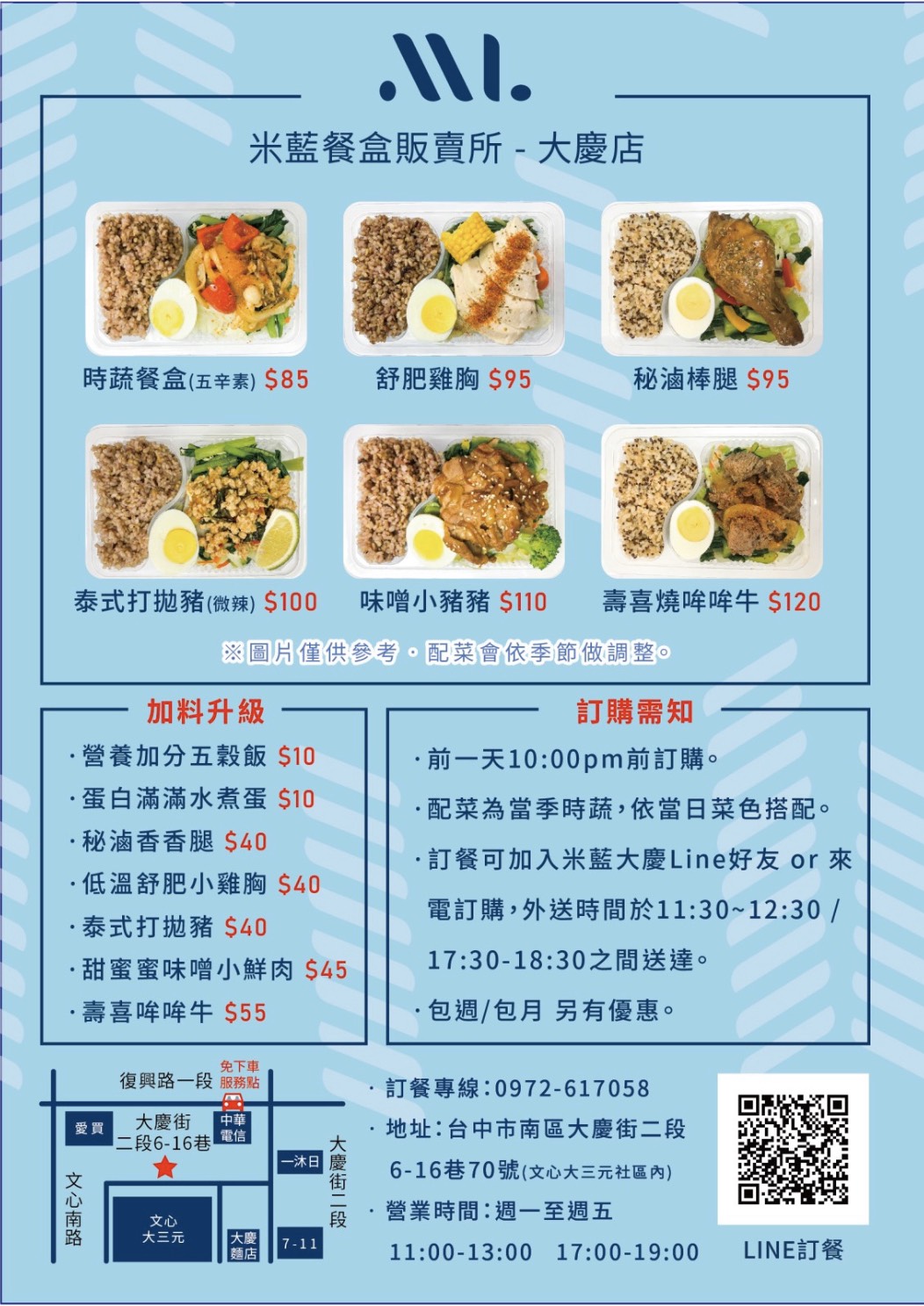 米藍餐盒販賣的不只是一個健康、誠實的餐盒,是喚起您對自己有意識的珍惜,是一種生活態度,是察覺,是陪您一起擁有健康的過程。低卡、低鈉、低GI澱粉、高纖的米藍餐盒,讓您維持體態不再孤躁乏味,控制熱量,維持健康,就是這麼簡單!送到您手中的,每一口都是誠實,每一味都是新鮮。