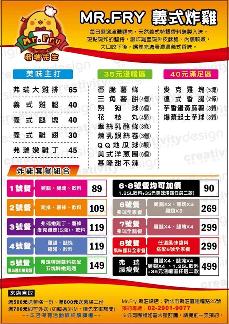 近捷運丹鳳站!有別於一般炸雞店的「Mr.Fry」,是一間義式風味炸雞專賣店,每日嚴選溫體雞肉,運用天然義式特調香料醃製入味,現點現炸的堅持,讓炸雞呈現外皮酥脆、內裏軟嫩的完美口感,大口咬下後,嘴裡充滿著濃濃義式香味,如此誘人,怎麼捨得不來品嚐 ~ 首次與GOMAJI合作推出超值折抵優惠,偶爾想來點不一樣的您推薦必Buy:)
