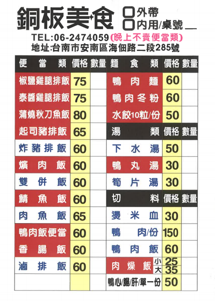 銅版美食 鴨肉麵/飯 MENU