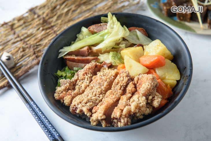 特選雞隻活動較頻繁的精華部位肉,拍打上薄薄一層麵衣入鍋高溫油炸一番!炸得又酥又脆的雞腿排,撒上些許椒鹽調味品嚐,皮脆不油膩、肉嫩不乾柴!配上一旁家常小菜與軟Q米飯一同大口享用,幸福滋味瞬間擁有!