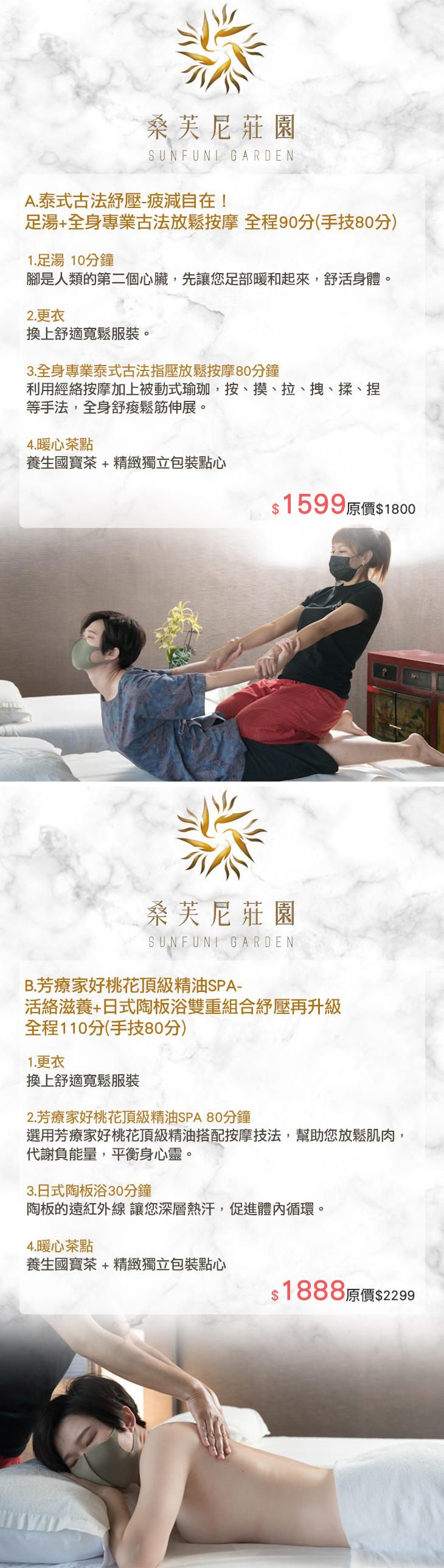 A.泰式古法紓壓-疲減自在!足湯+全身專業古法放鬆按摩全程90分(手技80分) / B.芳療家好桃花頂級精油SPA-活絡滋養+日式陶板浴雙重組合紓壓再升級全程110分(手技80分)