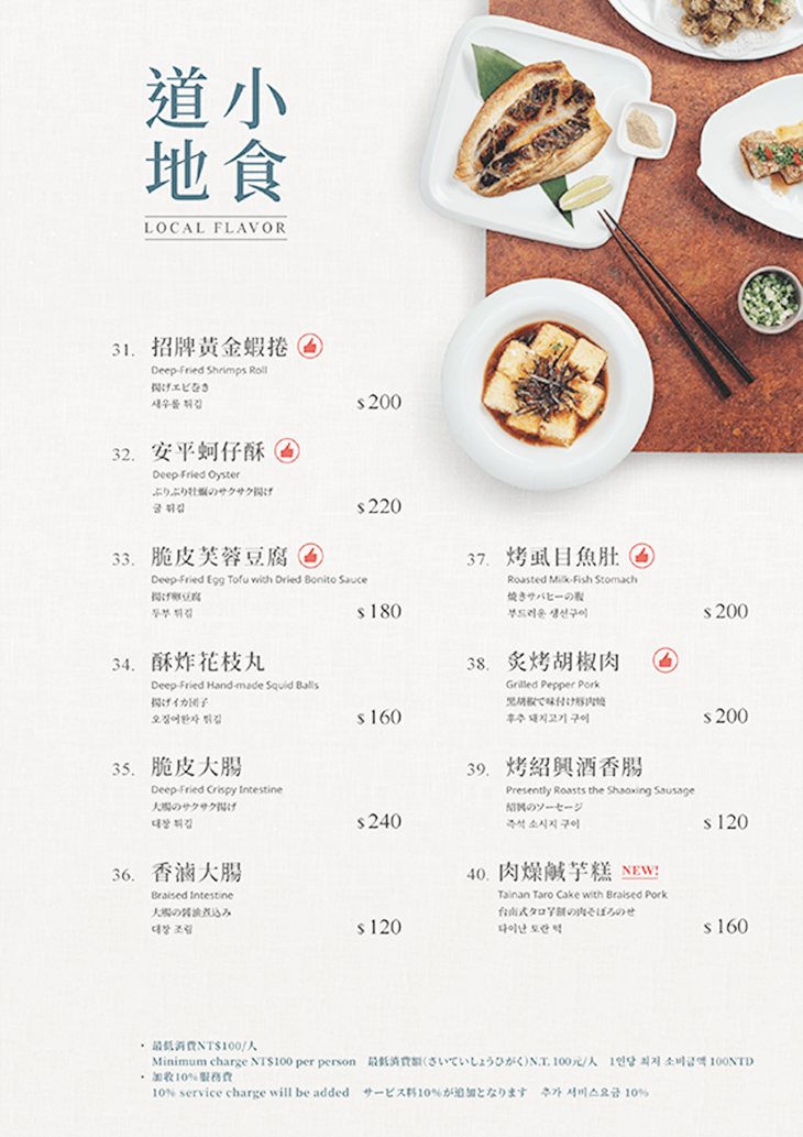 榮獲 2013 年亞洲最佳 101 餐廳,日本、韓國、香港、新加坡等觀光客來台必嚐的美味之一!【度小月】將擔仔麵傳統古法流傳至今,在美食料理上以新台灣料理自居,深度挖掘各地方特有食材,融合入時令、入菜,並呈現一道道與眾不同的菜色佳餚,讓色、香、味一應俱全的呈現。