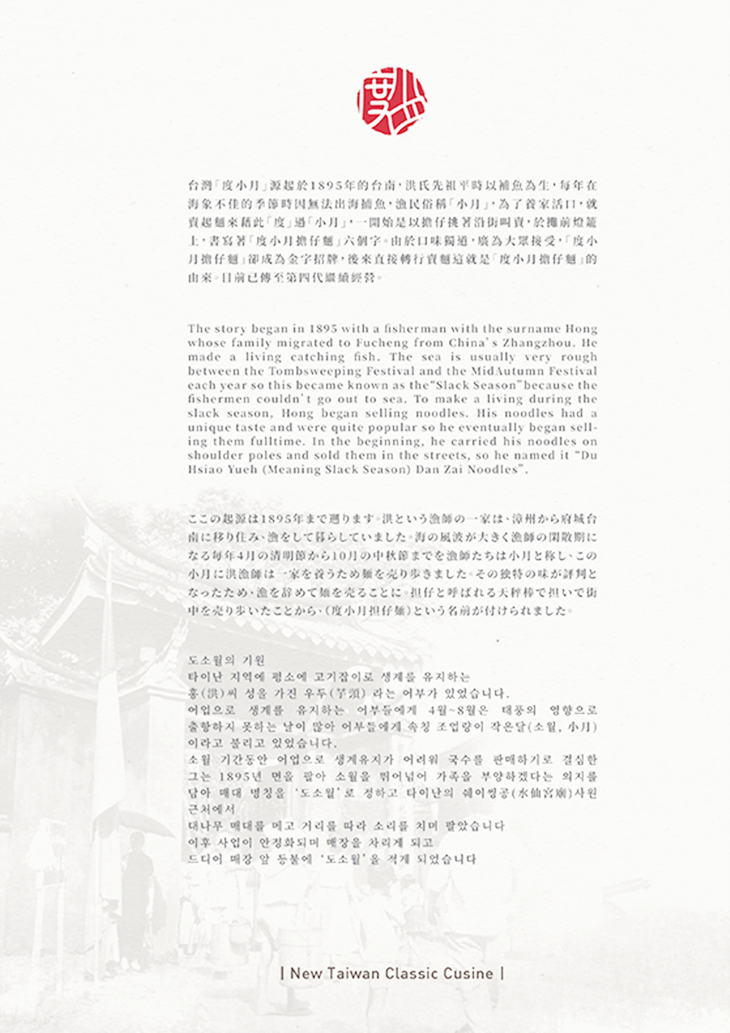 台灣「度小月」源起於1895年的台南,洪氏先祖平時以補魚為生,每年在海象不佳的季節時因無法出海捕魚,漁民俗稱「小月」,為了養家活口,就賣起麵來藉此「度」過「小月」,一開始是以擔仔挑著沿街叫賣,於攤前燈籠上,書寫著「度小月擔仔麵」六個字。由於口味獨道,廣為大眾接受,「度小月擔仔麵」卻成為金字招牌,後來直接轉行賣麵這就是「度小月擔仔麵」的由來。