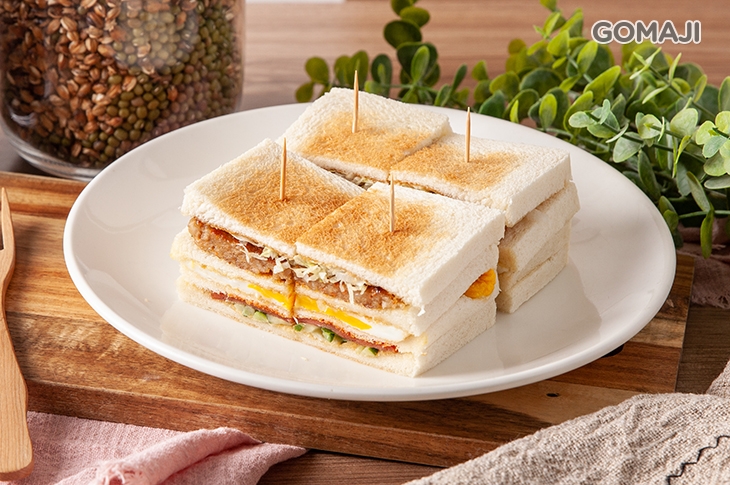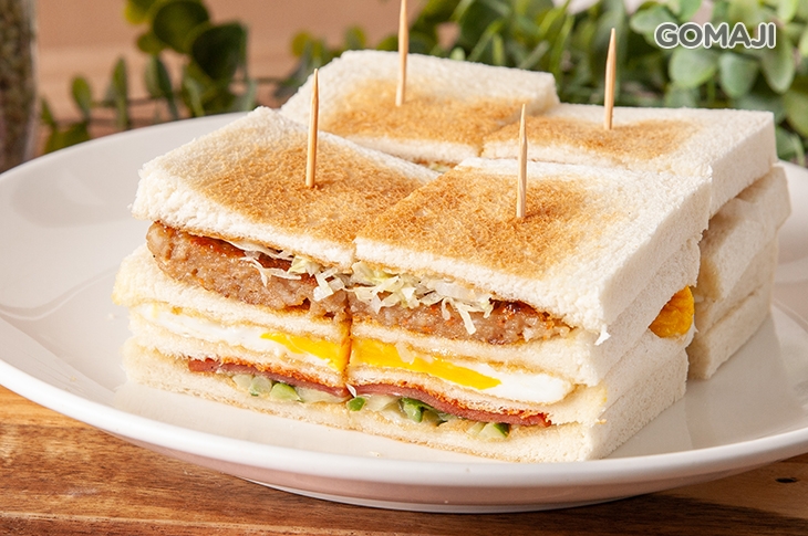 烤得酥香鬆軟的三層吐司麵包,夾入漢堡排、金黃煎蛋與小黃瓜、火腿等配料,厚實的份量料多味美,正是傳統早餐店中不可或缺的經典──總匯三明治!鹹香濃郁的漢堡排,在生菜、小黃瓜的襯托下點綴了些許清爽,一口咬下、大口滿足的滋味令人回味無窮,無論何時,都是風靡眾人的人氣王!