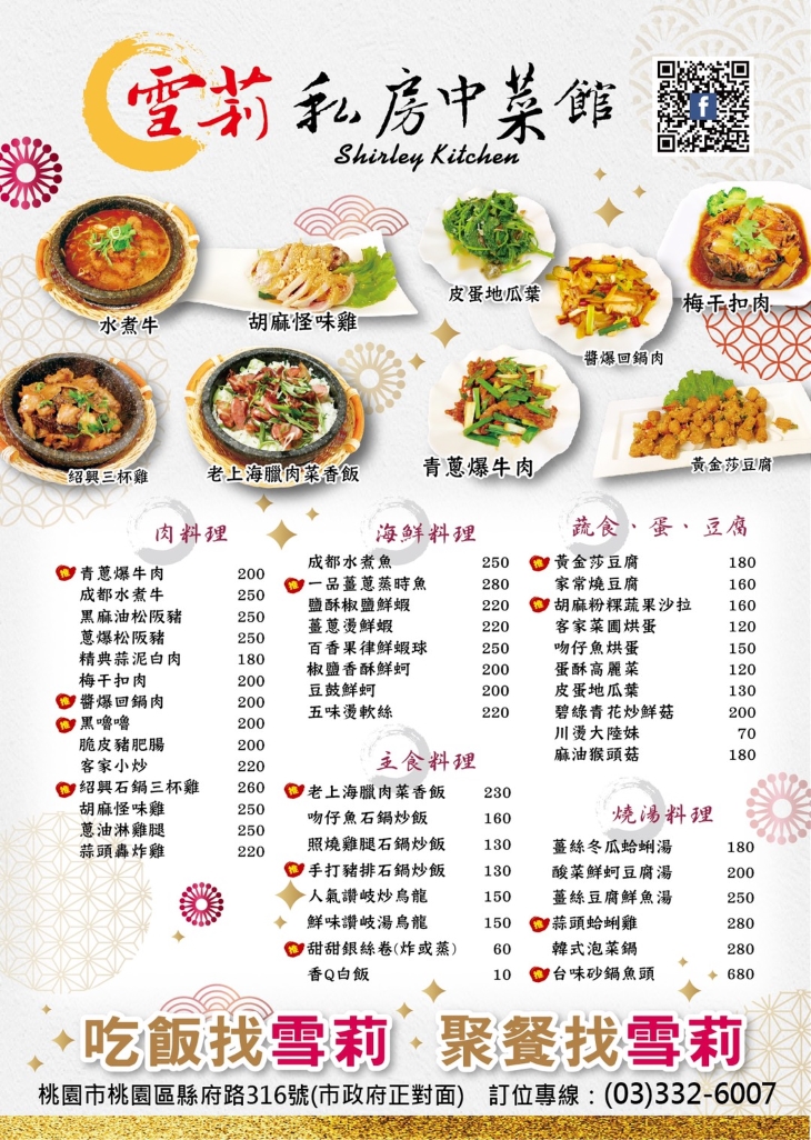 「吃飯找雪莉,聚餐找雪莉!」──深受在地人青睞的【雪莉私房中菜館】,一到吃飯時間,店內便高朋滿座,由此可見菜色之美味!嚴選食材、用心料理,堅持為您端上熱騰騰、風味最佳的中菜饗宴~獨具特色的口味,有著專屬的美味,和一般坊間的中菜館嚐起來很不一樣。更勝一籌的好味道,不僅家庭聚餐適合,和朋友歡聚、一同品味也是非常不錯的選擇唷!