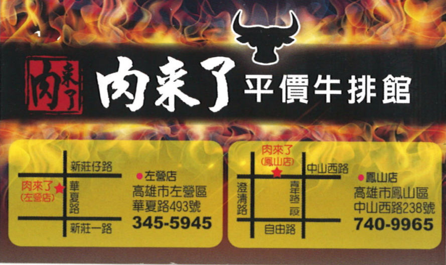 位於左營區華夏路上的「肉來了平價牛排館(左營店),餐點販售以平價牛排為主,迷人的肉香引誘不少愛吃牛排的饕客前往!除了寬敞舒適的用餐環境外,就是那超級親民的定價,在經濟不景氣下顯得格外醒目。老闆說:用自己的經驗把牛排做得好吃,「平價」要讓大家都能品嚐,在最合適的範圍裡把食材做得更加美味,用心烹煮也熱心服務,因為肉來了,你來了!