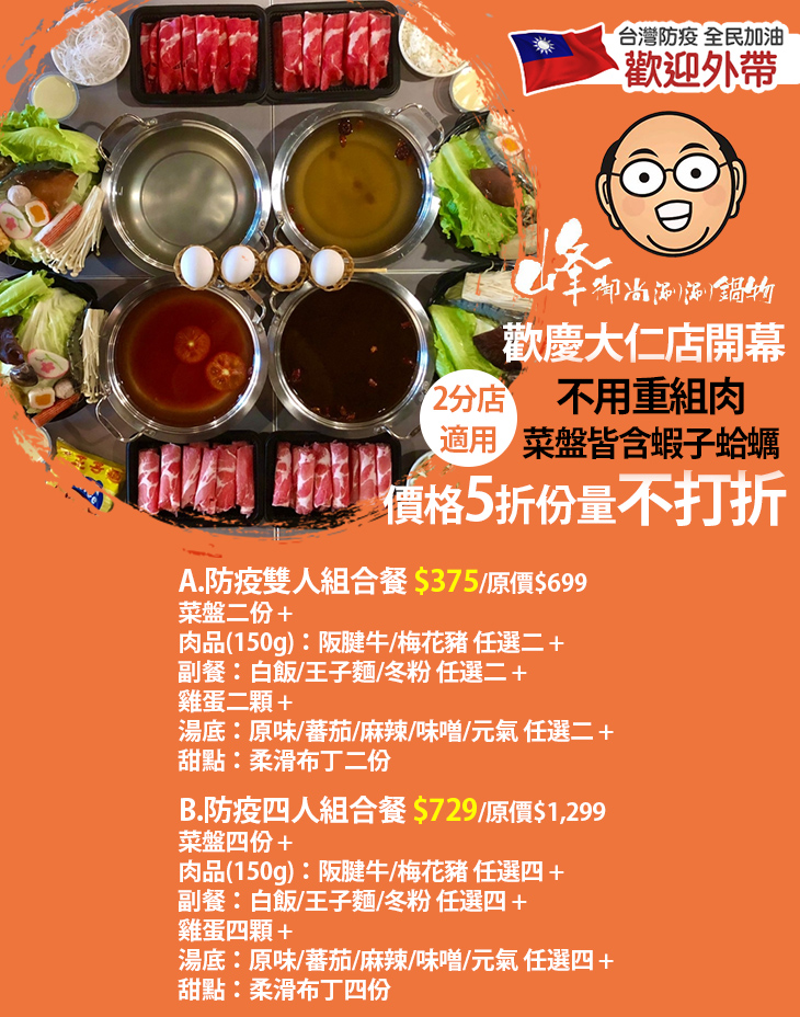 【峰御尚涮涮鍋物】特別推出火鍋外帶組合,精選備料、功夫湯底,讓您一次帶回家!省去採買、熬湯的煩惱與時間,輕鬆完成一份料多實在的豪華鍋物饗宴,和最親密的人一同在家享受『圍爐』的醍醐味!