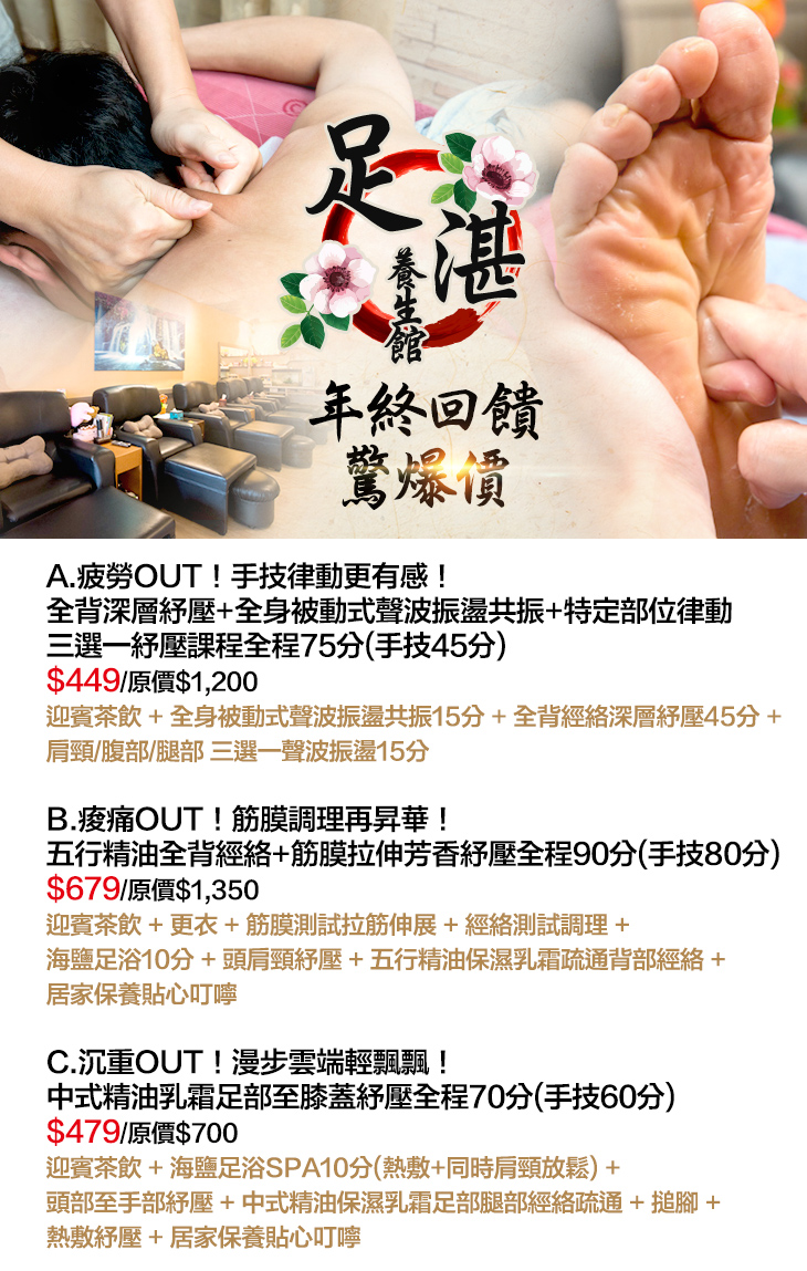 A.疲勞OUT!手技律動更有感!全背深層紓壓+全身被動式聲波振盪共振+特定部位律動 三選一紓壓課程全程75分(手技45分) / B.痠痛OUT!筋膜調理再昇華!五行精油全背經絡+筋膜拉伸芳香紓壓全程90分(手技80分) / C.沉重OUT!漫步雲端輕飄飄!中式精油乳霜足部至膝蓋紓壓全程70分(手技60分)