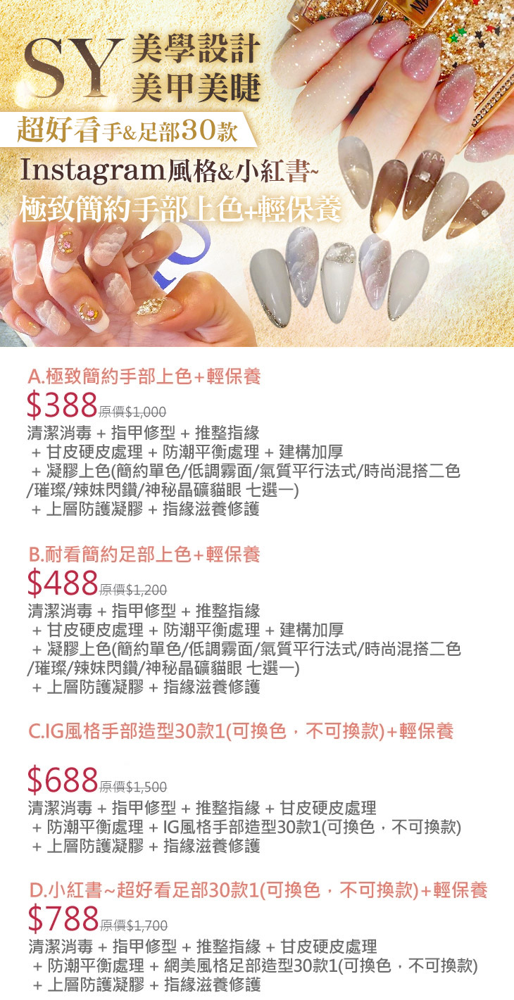 A.極致簡約手部上色+輕保養 / B.耐看簡約足部上色+輕保養 / C.IG風格手部造型30款1(可換色,不可換款)+輕保養 / D.小紅書~超好看足部30款1(可換色,不可換款)+輕保養
