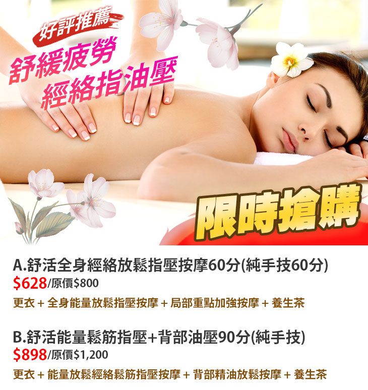 B.舒活能量鬆筋指壓+背部油壓90分(純手技)