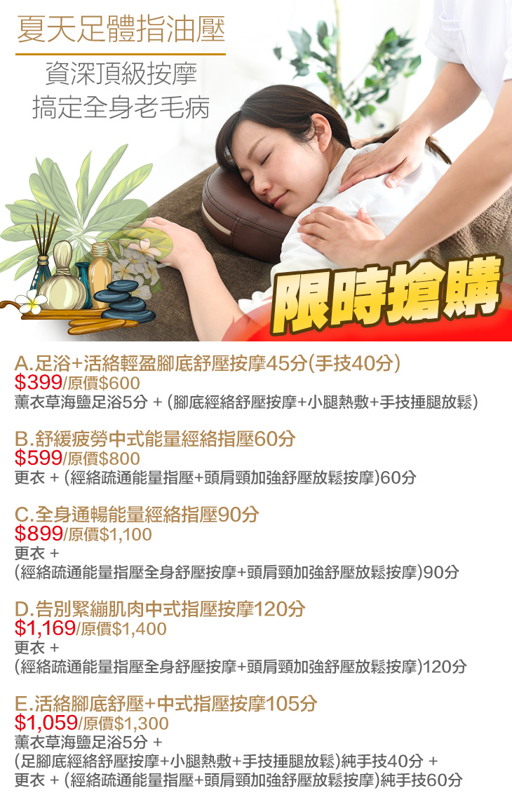 A.足浴+活絡輕盈腳底舒壓按摩45分(手技40分) / B.舒緩疲勞中式能量經絡指壓60分 / C.全身通暢能量經絡指壓90分 / D.告別緊繃肌肉中式指壓按摩120分 / E.活絡腳底舒壓+中式指壓按摩105分