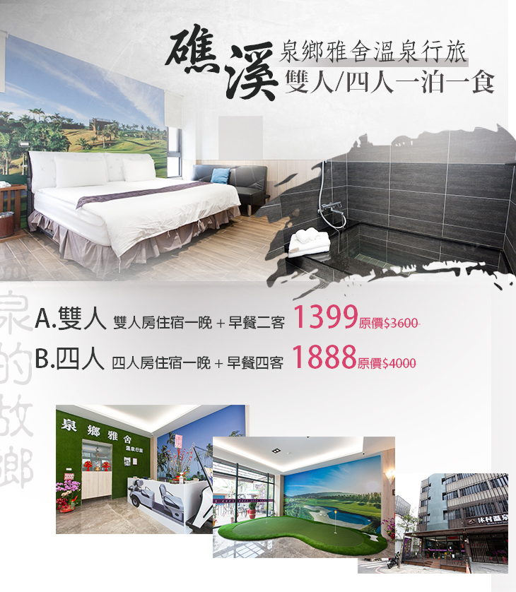 【泉鄉雅舍溫泉行旅】提供每一位從繁忙生活腳步中短暫脫離的城市旅人們,一處能自在放鬆的世外桃源!以住宿 / 休息結合泡湯設備為主要經營特色。主人翁更將室內特別營造休閒度假的風格,讓您一踏進行旅的第一步,就被這牆上的景色與眼前的造景給深深吸引,身心靈瞬間被帶往另一個國度。