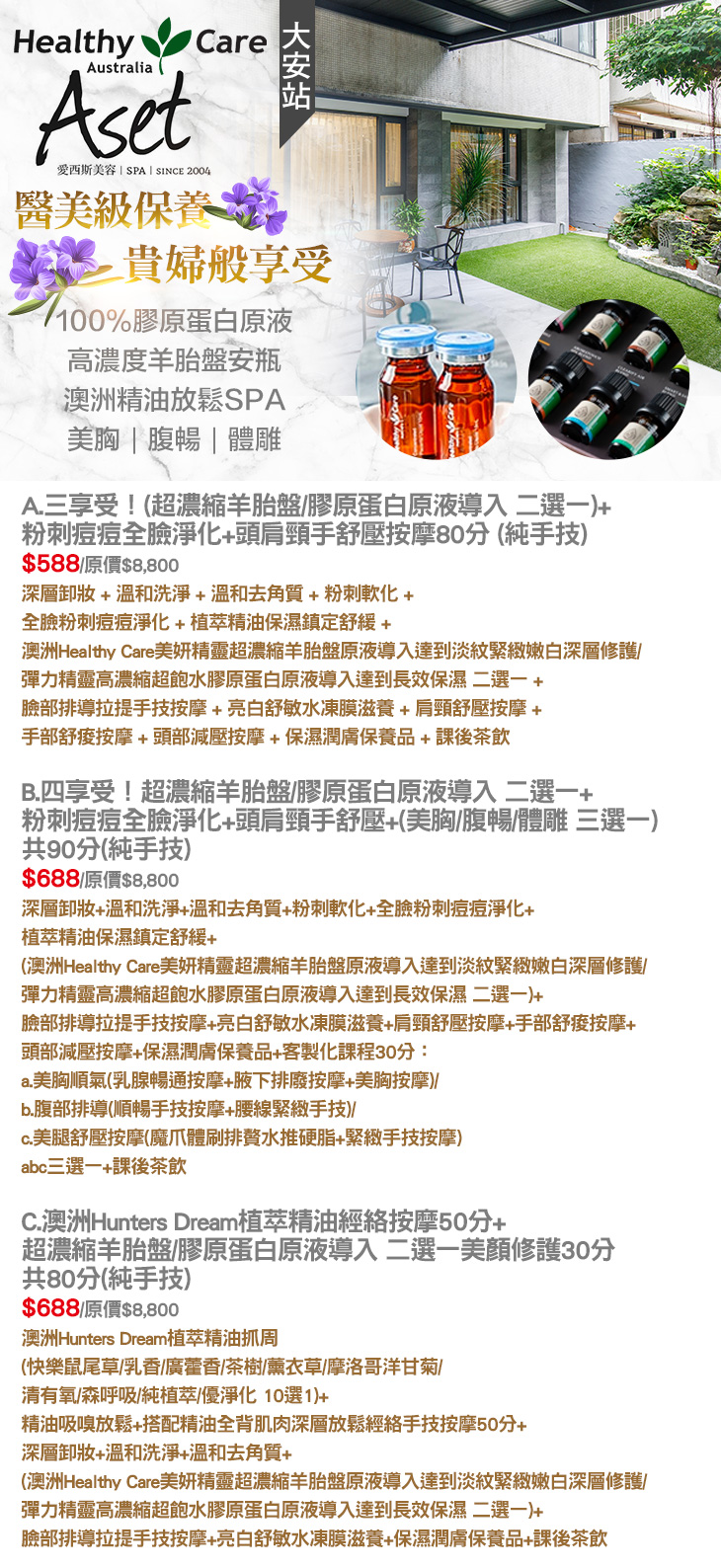 A.三享受!(超濃縮羊胎盤/膠原蛋白原液導入 二選一)+粉刺痘痘全臉淨化+頭肩頸手舒壓按摩80分 (純手技) / B.四享受!超濃縮羊胎盤/膠原蛋白原液導入 二選一+粉刺痘痘全臉淨化+頭肩頸手舒壓+(美胸/腹暢/體雕 三選一)共90分(純手技) / C.澳洲Hunters Dream植萃精油經絡按摩50分+超濃縮羊胎盤/膠原蛋白原液導入 二選一美顏修護30分共80分(純手技)