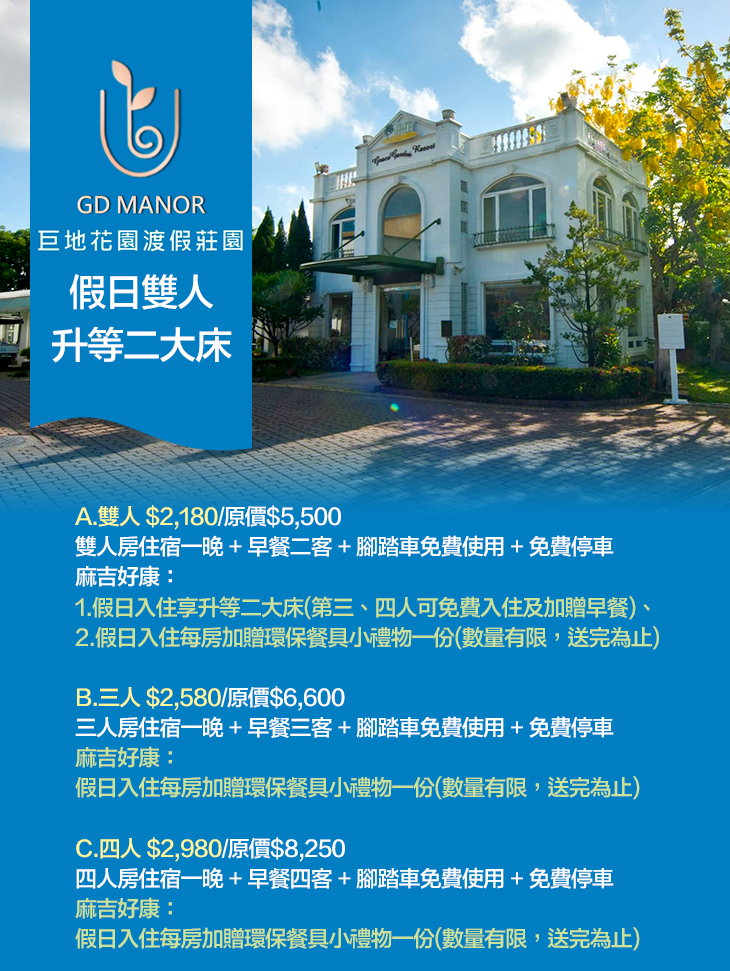 ★麻吉好康:假日入住每房加贈環保餐具小禮物一份,A方案再享假日入住升等二大床(第三、四人可免費入住及加贈早餐)!