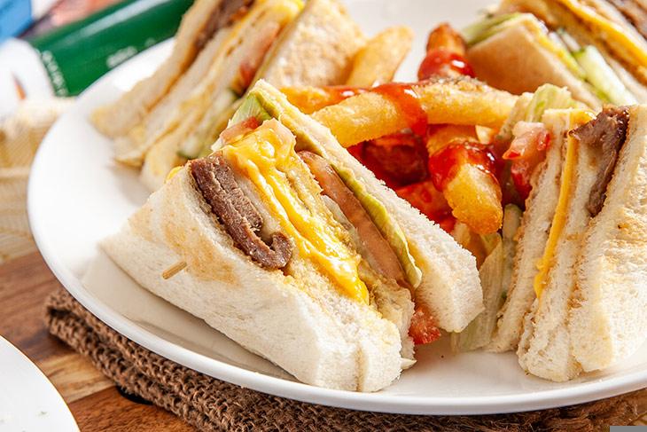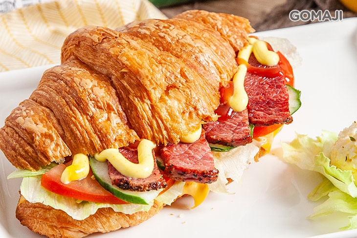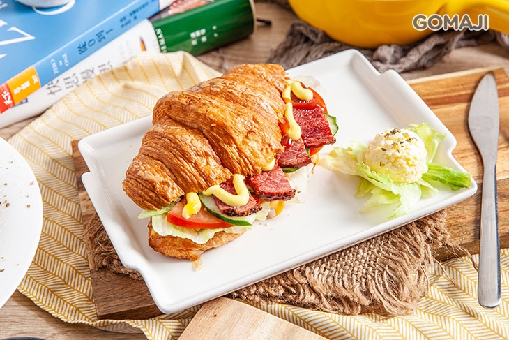 小編的最愛 - 燒烤牛可頌!現烤出爐的香酥可頌,裡頭鋪上一層又一層精選餡料,有生菜、有蕃茄,還有主角 - 燒烤牛,最後再澆淋上蕃茄等淋醬相互提味入口,清爽又美味喔!牛肉因燒烤過後,獨特香氣與滋味被牢牢鎖住,與外酥內軟的烤可頌相襯,這組合吃過不豎起大拇指給個讚都不行啊 ~