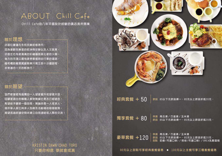 【Chill Cafe】由八年平面設計經驗的黃店長所開業!店面位置選在永和民樂街巷弄內,因為看好民樂里的乾淨與安靜以及藝術性,店面左右有著滿滿的彩繪牆面美化著防火巷,後方的河濱公園有著停車場與自行車的道路,更方便的是旁邊的福和橋距離寶藏巖與公館商圈騎車只需五到十分鐘的路程,非常適合一天的輕旅行!