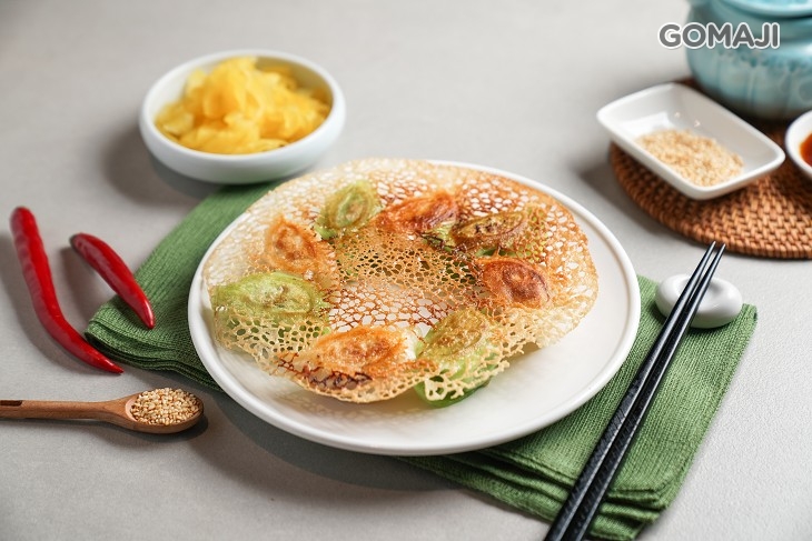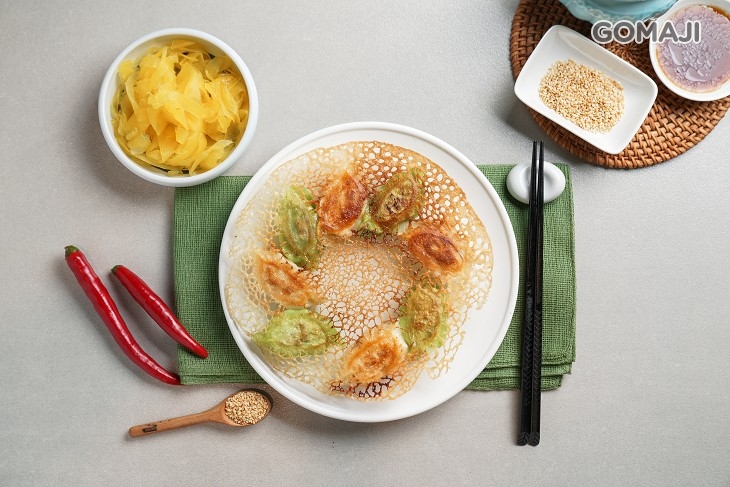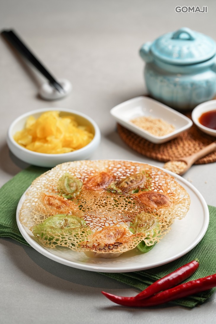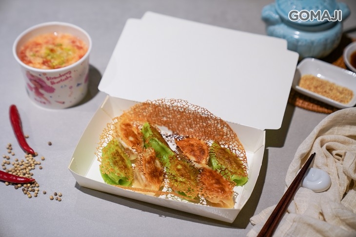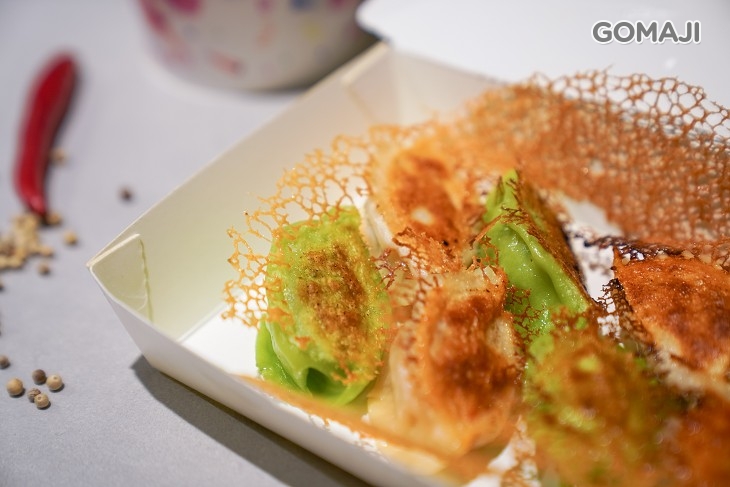 使用特別比例的麵粉水,加上仔細掌握火侯,才能煎出香脆美麗的手工煎餃。有如雪花般輕薄香脆的麵皮,將顏色繽紛的煎餃一一串連著,彷彿串起人們的情感般,不禁讓人想起小時候的那份純粹和感動。每一個煎餃都包覆著鮮熱多汁的內餡,一口咬下,迷人的蔬菜香、豬肉鹹香在嘴裡溢出,帶給味蕾無限的驚喜與滿足感!