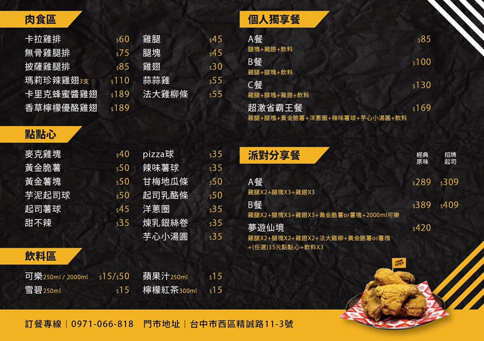 嚴選新鮮上好的食材,堅持現點現炸,掌握黃金秒數與獨門調味手法,讓炸雞擁有金黃酥脆的外衣,更緊緊鎖住豐盈的鮮甜肉汁,肉質更是鮮嫩細緻,除了主打炸雞排、雞腿、雞翅等以外,還自創研發了獨門佐醬,讓您的味蕾題演前所未有的美食饗宴。「披薩雞腿排」也是本店的超人氣餐點,眾多的炸物選擇,讓您在螢幕前便垂涎了嗎?心動不如馬上行動唷~趁著這一波超值好康優惠,趕緊前來大快朵頤一番吧!讓【法大炸雞】成為您下午茶和宵夜的最佳選擇!