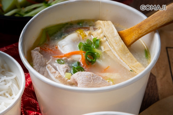 將生肉、生菜丟入剛滾好的高湯中,等食材慢慢熟後就可以開始食用,嚐起來溫潤順口,搭配脆甜的紅蘿蔔絲一起享用,更加清爽解膩 ~