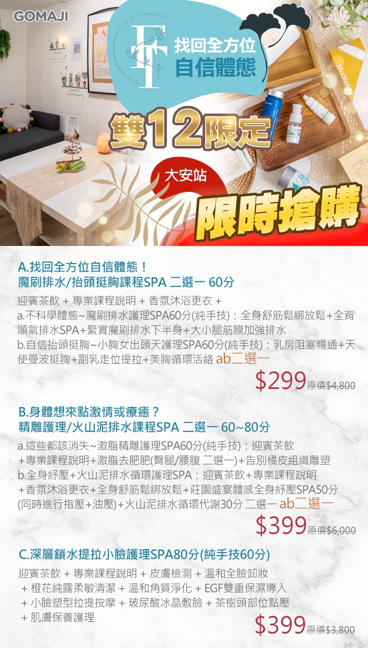 A.找回全方位自信體態!魔刷排水/抬頭挺胸課程SPA 二選一60分 / B.身體想來點激情或療癒?精雕護理/火山泥排水課程SPA 二選一60~80分 / C.深層鎖水提拉小臉護理SPA80分(純手技60分)