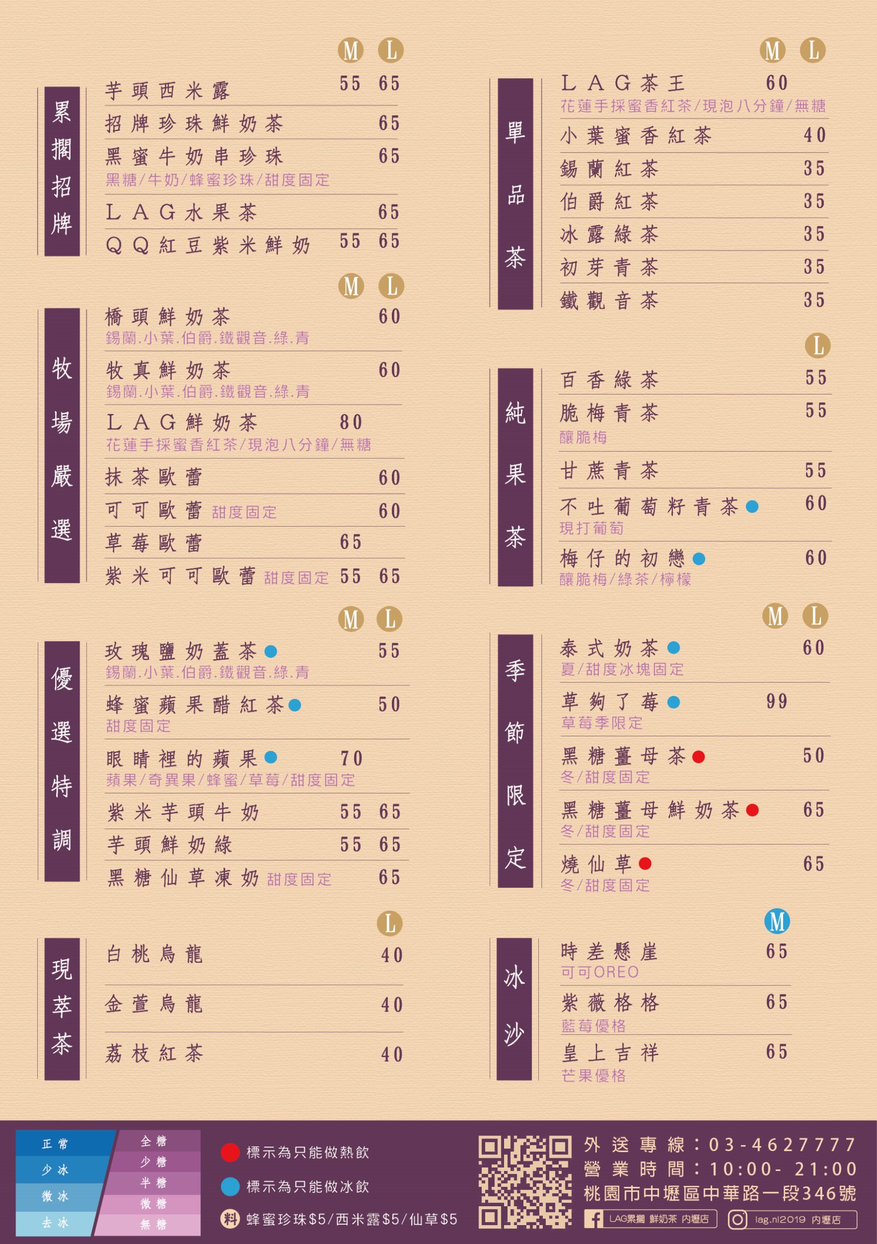 在公司裡總有忙不完的工作、上課總有數不清的回家作業,晚上回到家還要做家事、顧孩子等,“忙碌”兩個字似乎填滿了我們的生活,是不是常常感到心累、腦袋當機了呢?「LAG累擱鮮奶茶堂」就像是讀懂我們想法的存在般,想用不一樣的方式治癒我們的心。細心挑選善待土地的原物料,產出最原始的風味、呈現最簡單的甘醇,堅持不為了增添風味而添加任何化學調味劑,讓大家品嚐與大自然和內心的共鳴。多種鮮奶飲品、純粹好茶幫您趕走煩悶,每喝上一口,都覺得心情被療癒了。:)