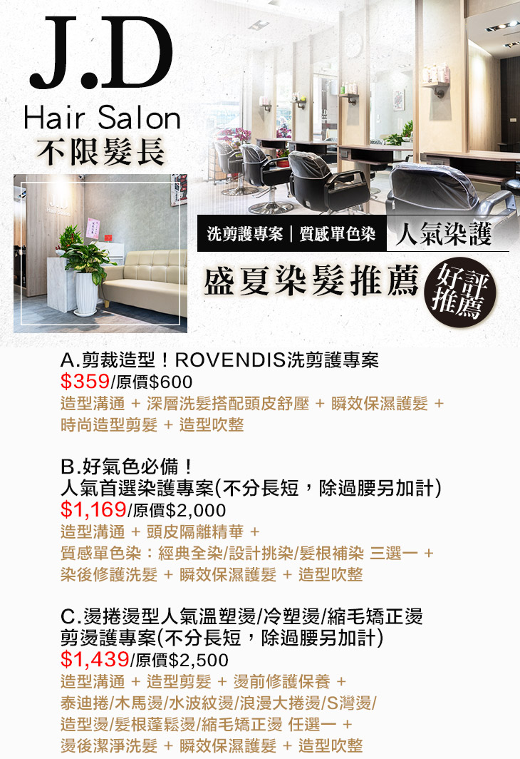 A.剪裁造型!ROVENDIS洗剪護專案 / B.好氣色必備!人氣首選染護專案(不分長短,除過腰另加計) / C.燙捲燙型人氣溫塑燙/冷塑燙/縮毛矯正燙 剪燙護專案(不分長短,除過腰另加計)